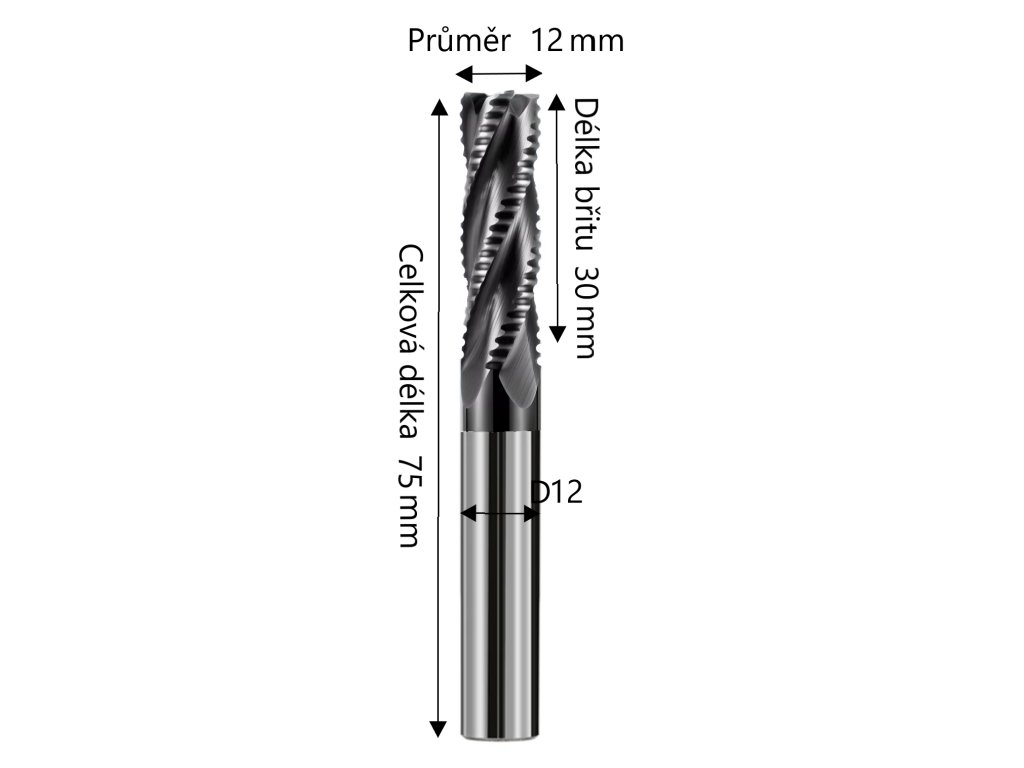 Monolitní tvrdokovová fréza Ø12x30xD12x75L ( 4-břitá ) 66HRC Hrub