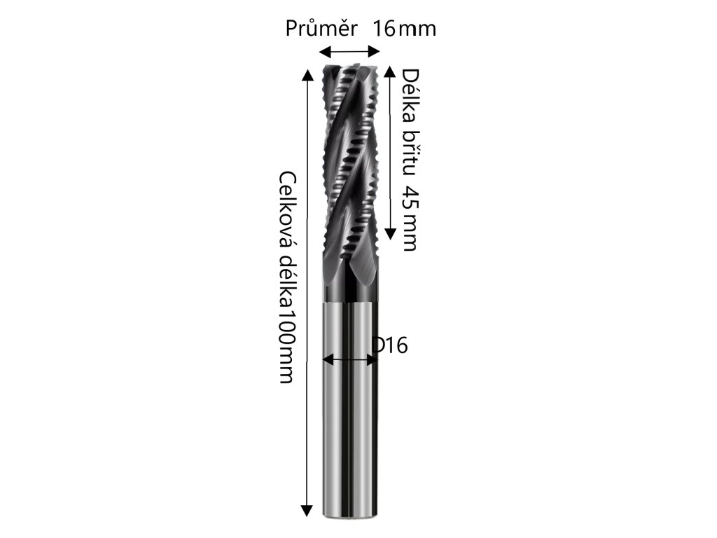 Monolitní tvrdokovová fréza Ø16x45xD16x100L ( 4-břitá ) 66HRC Hrub